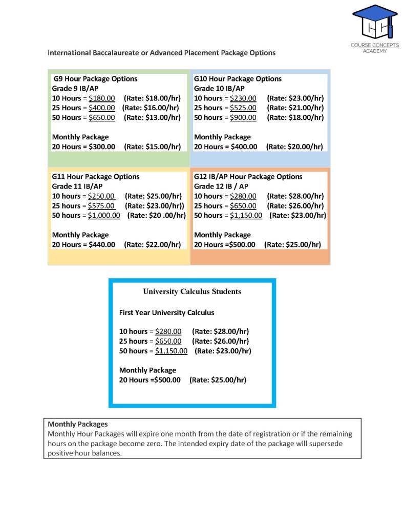 1. All packages must be paid in full. Partial payments will not be accepted for packages. Packages will only be received if payment is preformed prior to the tutoring service. Otherwise, the hourly rate will be appropriately applied in association with the student’s grade level and hourly balance.